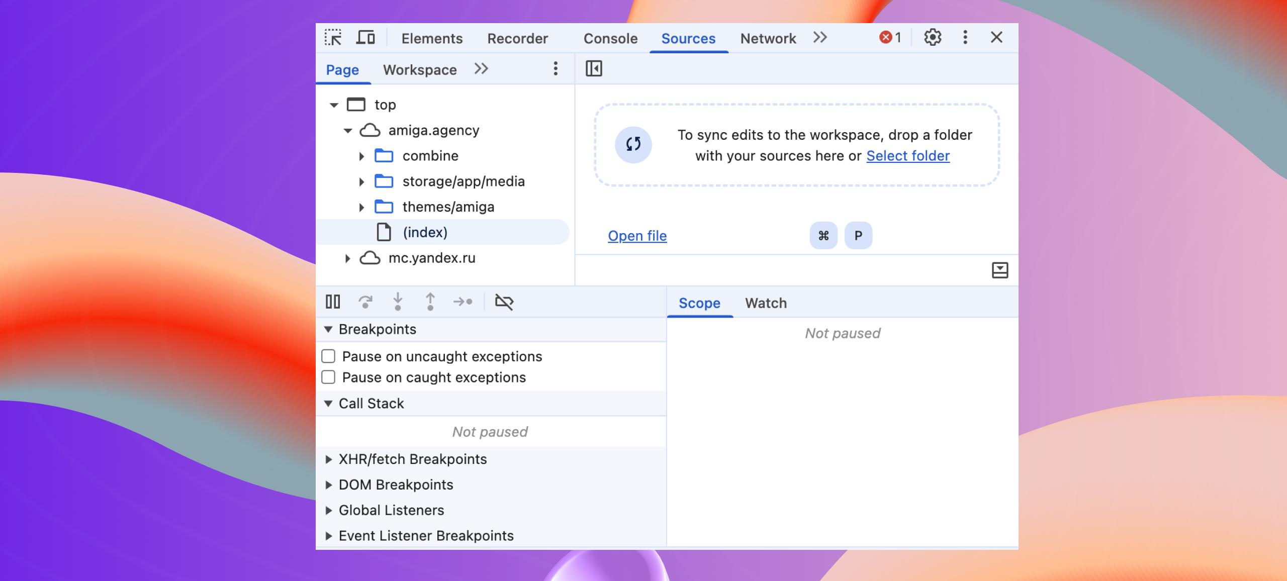 Вкладка Sources позволяет отлаживать сложные скрипты и для этого просматривать файлы, которые есть на сайте: HTML, CSS, JavaScript, изображения, шрифты. Здесь можно: