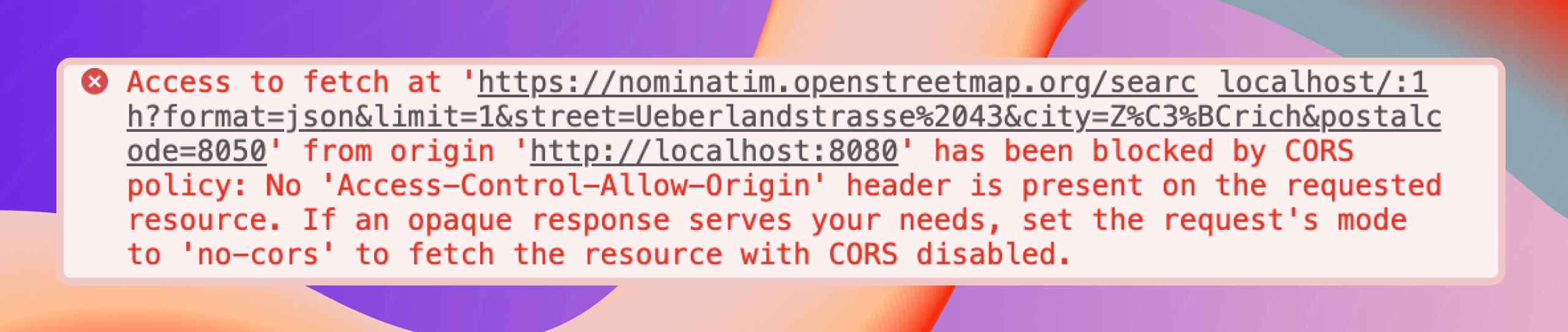 Ошибка CORS — политика безопасности браузера запрещает запросы между разными доменами без разрешения.
