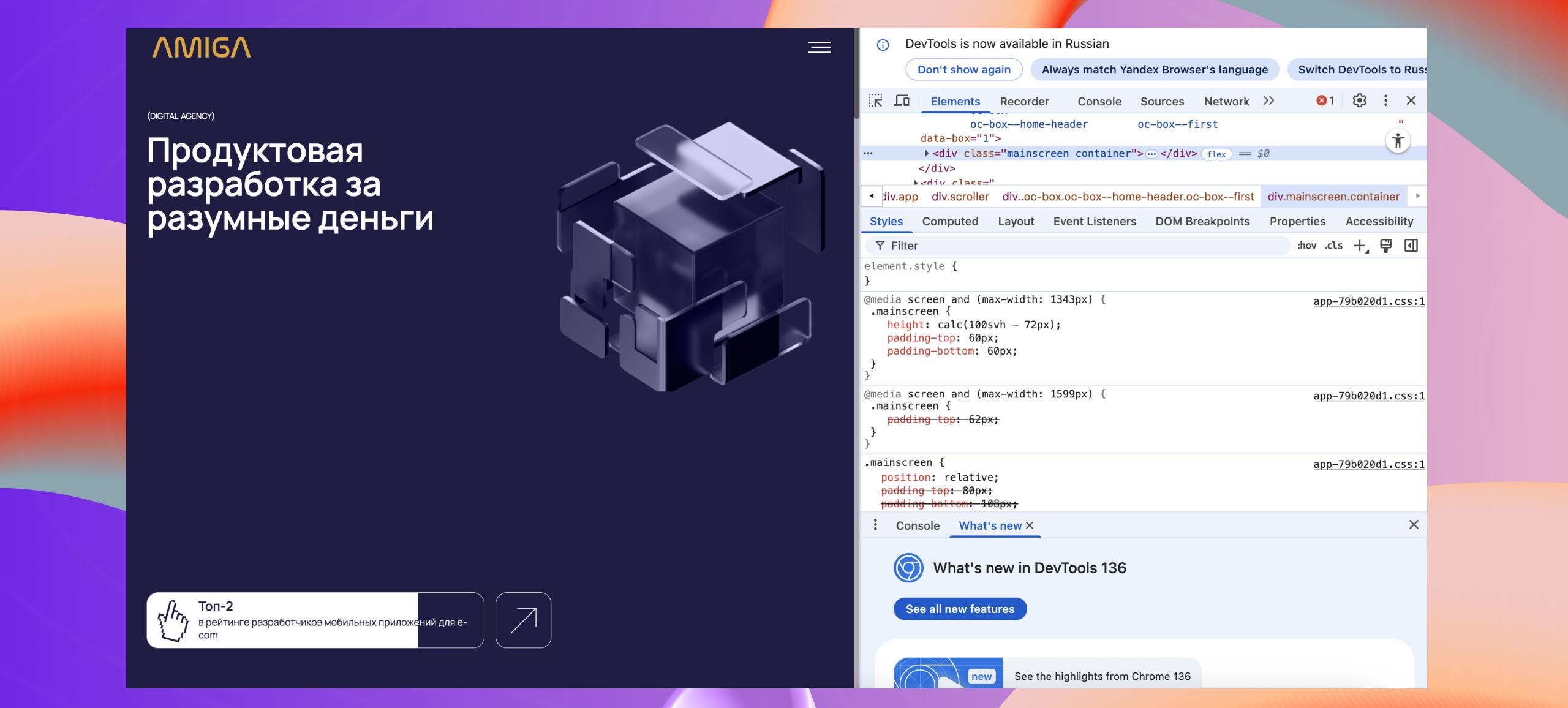 Вкладка Elements демонстрирует структуру страницы, может изменить теги, добавить или удалить классы, отредактировать стили. Все изменения начинают действовать мгновенно, позволяя оценить исправленный визуал без перезагрузки страницы.