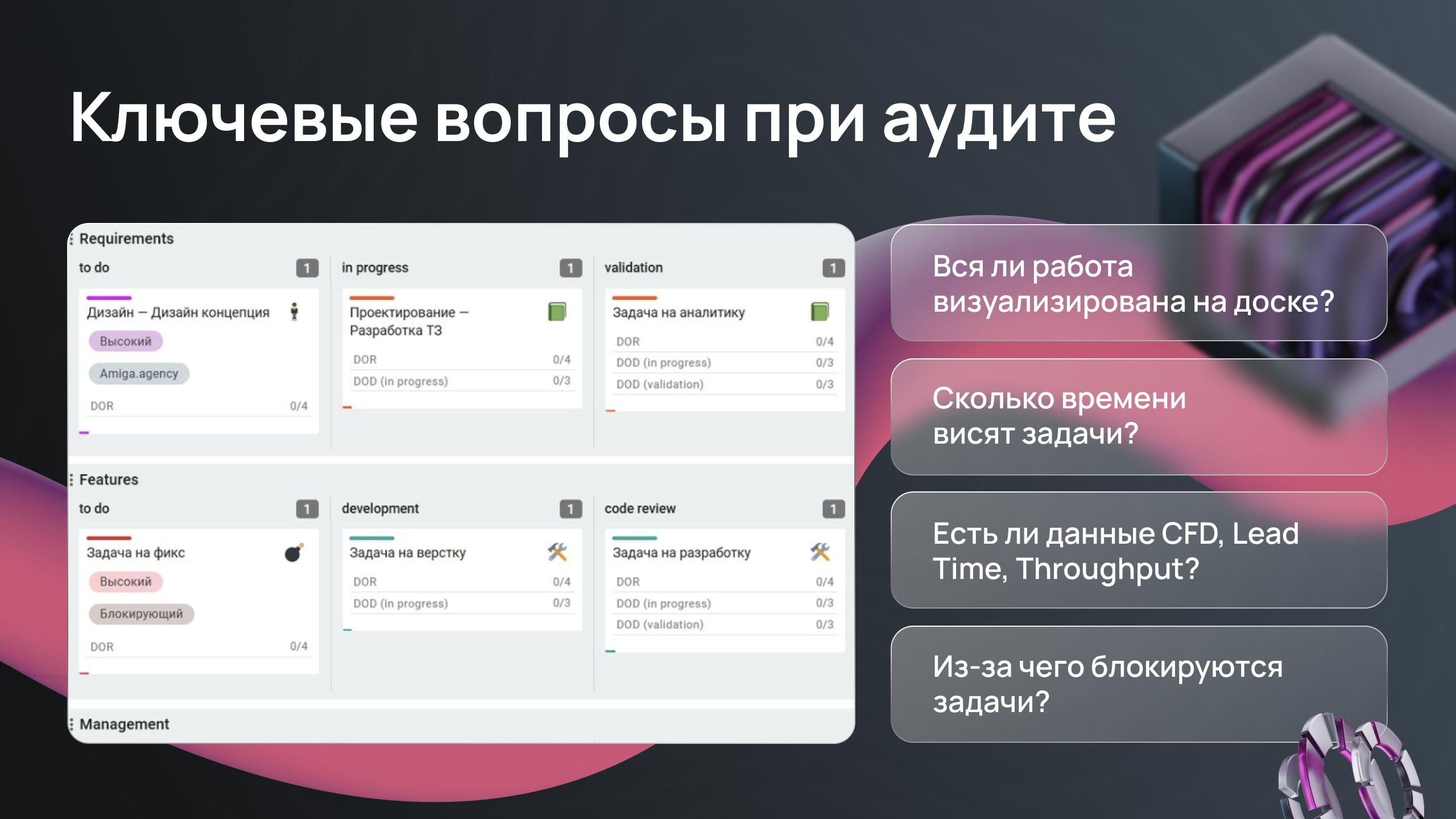 Мы применили наш подход Amigaban: проверили доску по чек-листу, понаблюдали за движением задач и нашли все, что тормозит поток. Где висят блокеры, где теряется прозрачность. И главное — как это можно поправить, не ломая привычную систему, а перестраивая ее изнутри.