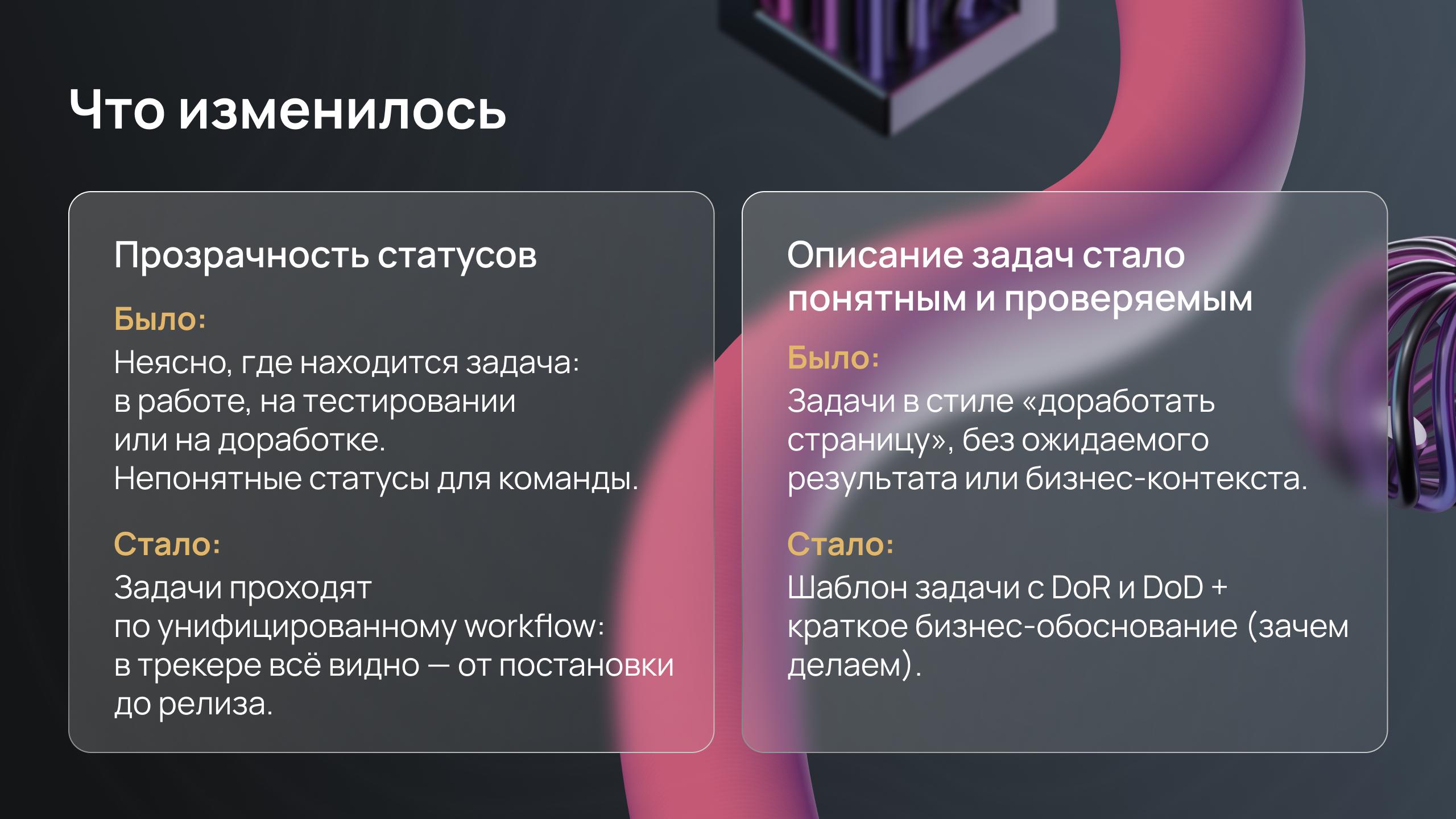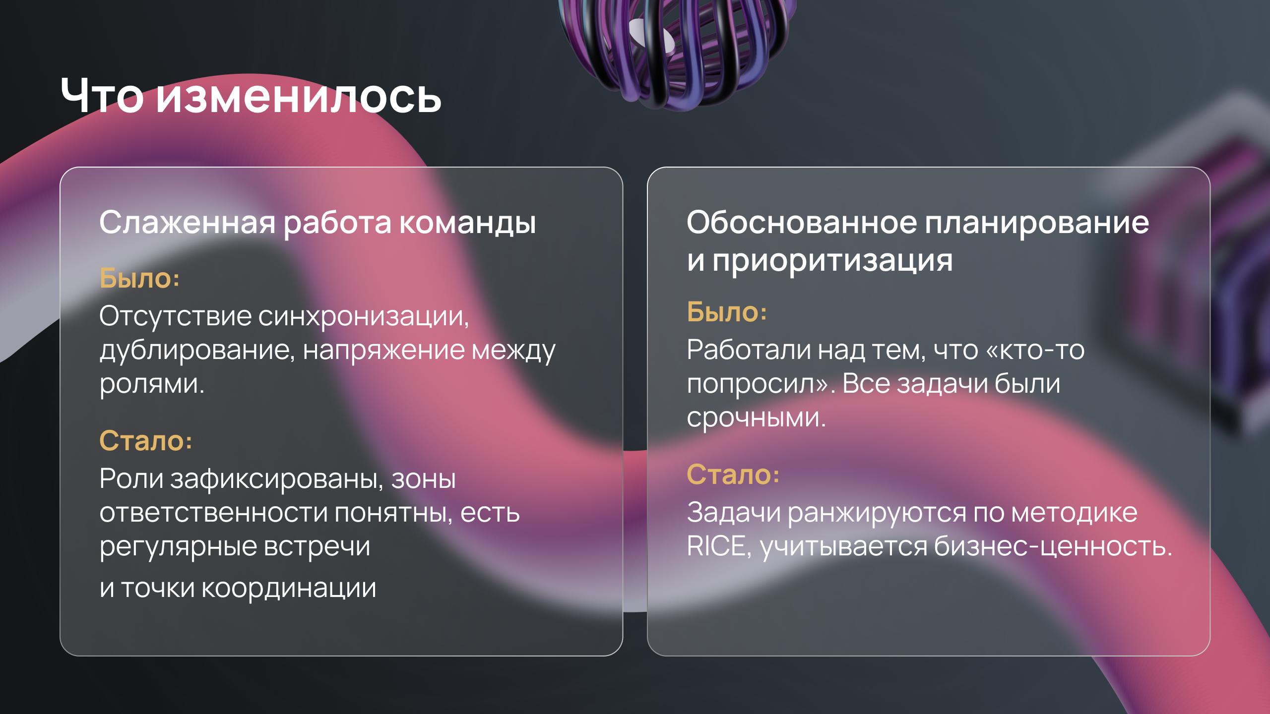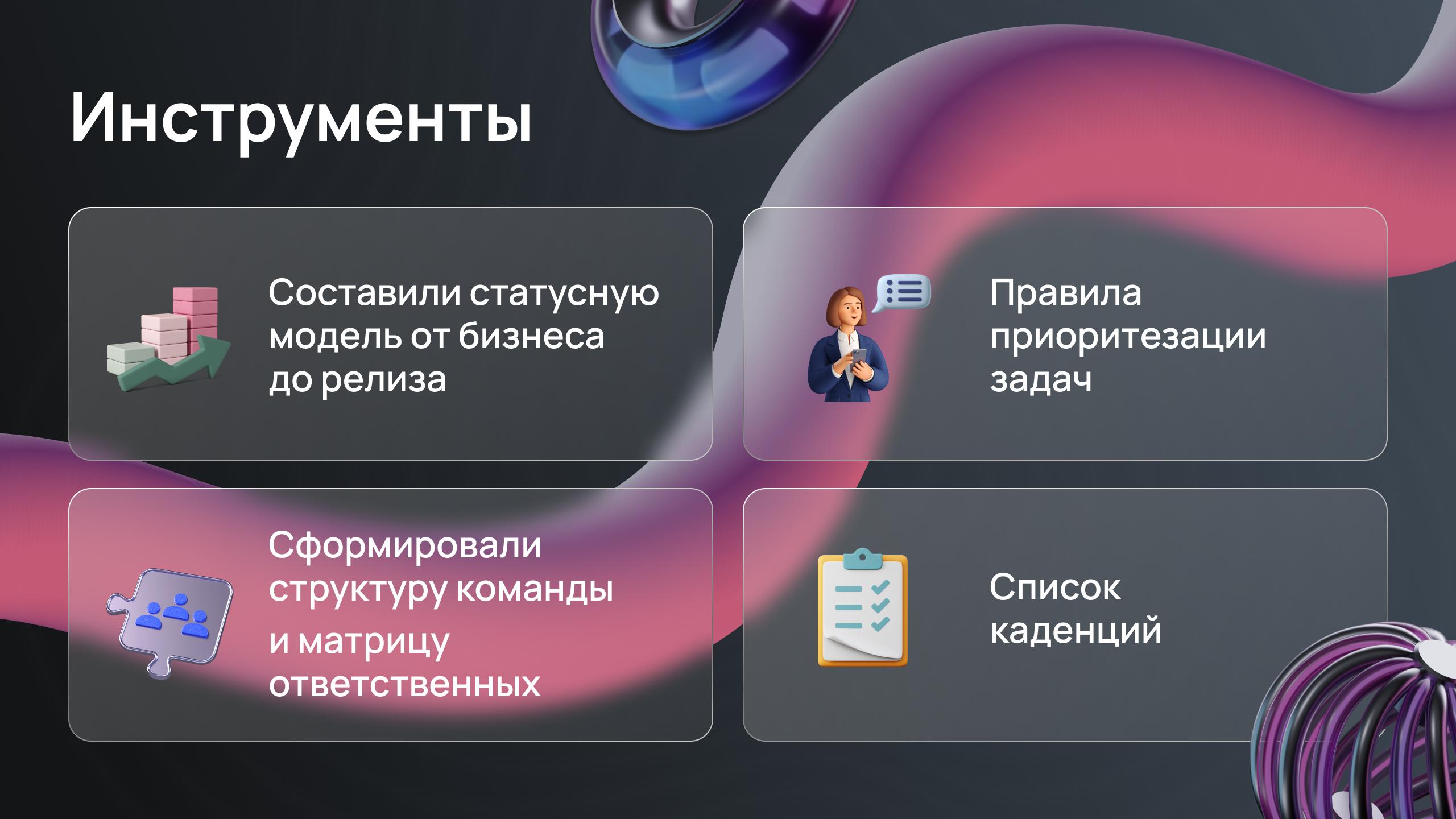 На основе фидбека вносили точечные изменения: донастроили статусную модель, пересмотрели каденции, упростили правила приоритезации. Главное — не бояться менять, если что-то не работает.