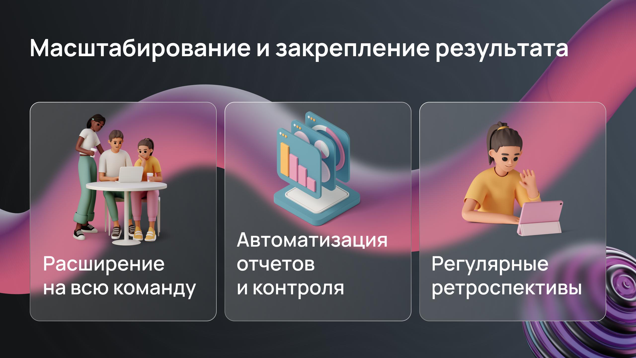 После отладки на пилоте — двинулись дальше. Расширили практики на всю команду, добавили автоматизацию, ввели регулярные ритуалы. Так система перестала зависеть от «везения» и начала работать стабильно.